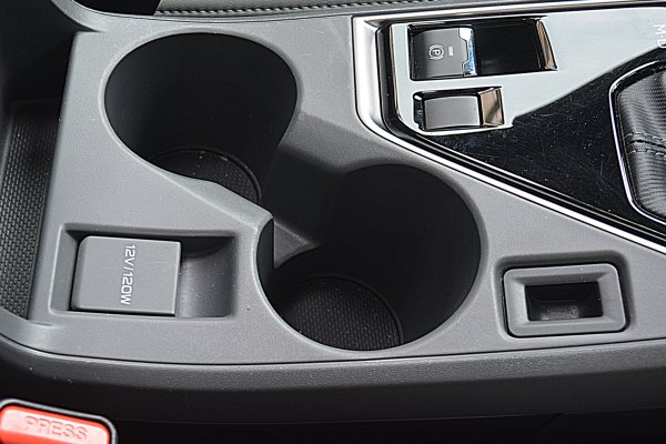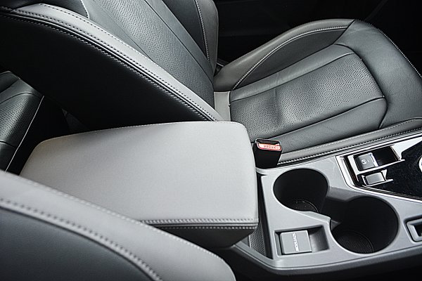 中央鞍座設計相當簡潔,結合排檔桿座霧銀飾條與鋼琴黑烤漆面板,提升質感,但排檔未具備線傳科技,換檔仍採用傳統排檔桿,科技感仍有升級空間。鞍座還附有全車系標配的電子式手煞車加上雙置杯架和12V電源插孔,但沒有Auto-Hold功能。中央扶手置物箱夠深,但不夠寬,同時也沒有分層置物功能,置物收納稍嫌簡約。但前座有寬大且大開口的手套箱,門側置物格也有大容量和分格設計。