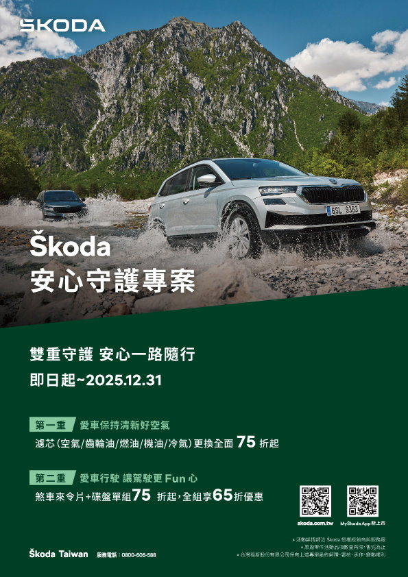 Škoda 向來以「Human Touch — 以人為本的細膩關懷」作為品牌核心,從車輛設計、駕馭體驗到售後服務,都以貼近人心的方式提供支持。這次的「安心守護專案」,不僅是一次優惠活動,更是對每一位 Škoda 車主的承諾——無論行經城市街道,或奔馳山野公路,Škoda 都以專業技術與誠摯關懷,守護每一次動力啟程。