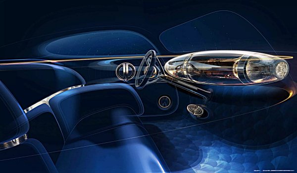 駕駛座配置1930年代風味的四輻式大圓方向盤,方向盤前面是透明的齊柏林式樣儀表板,而儀錶板則結合動畫模擬式的顯示螢幕,讓人聯想到精緻的計時器。概念車儀表板的中央有四個傳統風格的時鐘,其中一個時鐘兼作AI人工智慧助理,為復古美感增添了未來主義色彩。