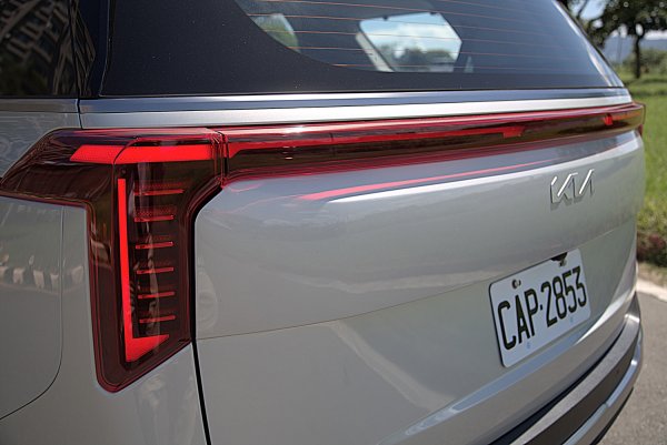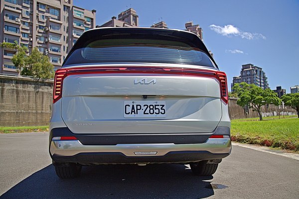 車尾線條更俐落的車尾, LED尾燈造型設計呼應車頭燈,也採用Star Map星圖LED尾燈組,同時透過新的光條串接左右尾燈,讓車尾更顯寬闊,加上後尾翼附LED第三煞車燈與隱藏式後雨刷的設計。KIA的logo不在居於光條的正中間,而是移到車尾下方,後保桿也做了修改,加了更寬厚的霧銀飾板,霧銀的車頂架為本車的標配,不是裝飾性的配件,而是具有實用功能可掛置物箱橫樑的車頂架。