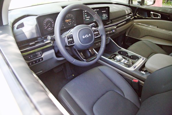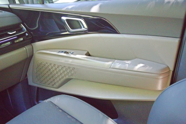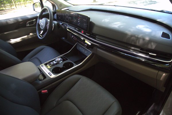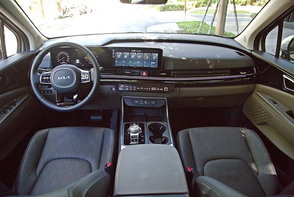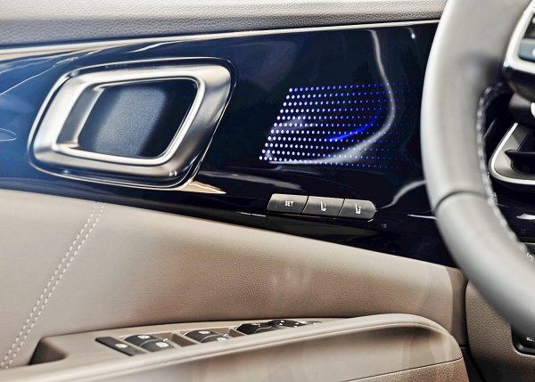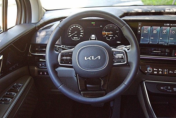 座艙也是Carnival的一大賣點,比起同級的日系車,其內裝精緻度和配備豐富性,有過之而無不及,儀表台採水平線條做為主要設計元素,包括空調出風口格柵,結合新的64色可調式氣氛燈,格柵內嵌氣氛照明,門側亮黑飾板更運用氣氛照明的投影特殊技術,讓飾板產生漸層圓點,構成沉浸式的豪華氛圍,而門側音響喇叭外蓋也採用繁複典雅的設計。儀表台也換上全新的數位配件,以大塊曲形面板整合12.3吋的數位儀表和中控資訊娛樂系統觸控螢幕。