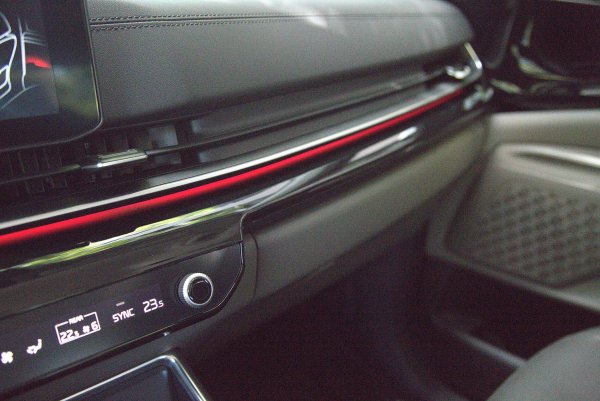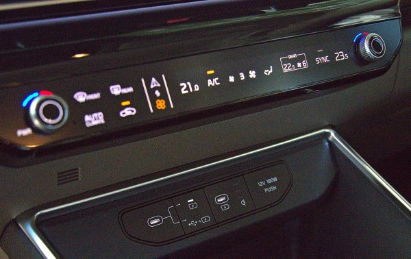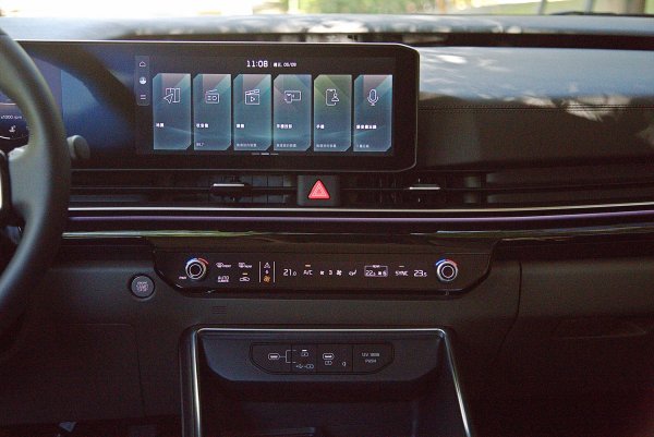 中控下方空調控制面板採實體雙旋鈕搭配觸控面板,並且具有一鍵切換觸控介面,整合影音與空調功能,按下面板上的箭頭選項,即可改變按鍵與旋鈕的功能,用以調整空調或多媒體系統,讓實體按鍵精簡化 ,變成更容易直覺式操作的界面。空調為雙區恆溫空調,後兩排座僅配備空調出風口,若能標配四區恆溫空調,那麼其奢華程度將會完全輾壓對手。
