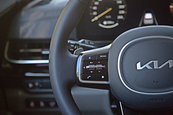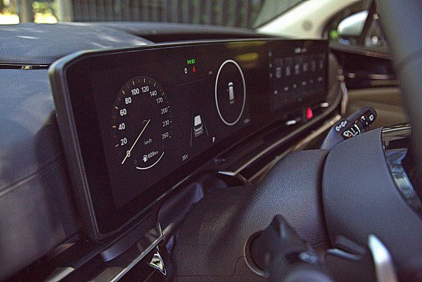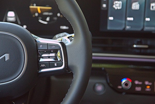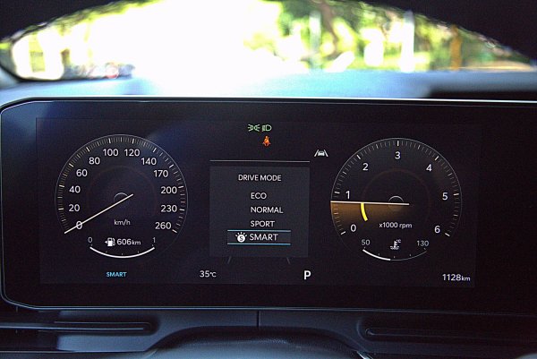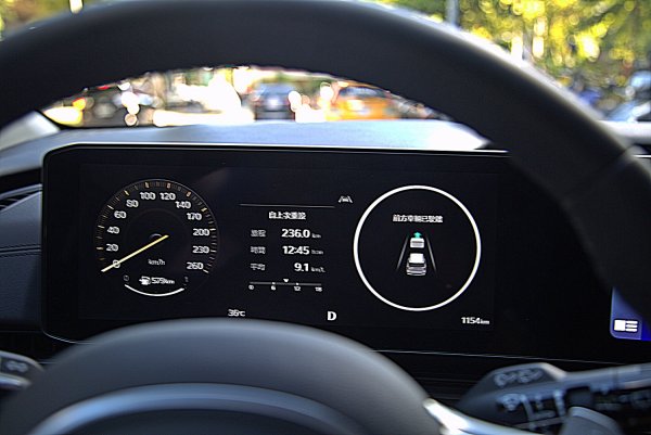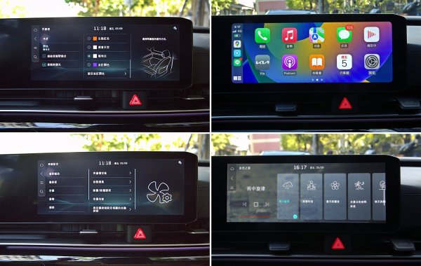 12.3吋數位儀表大致和改款前相同,但是有一些新的顯示功能,首先是介面終於改為全中文化,符合本地買家的需求,儀表除了傳統的雙環式樣,也新增更有簡約而科技感的數位顯示樣式,可在中控螢幕上進行設定選擇,而儀表中央顯示區可依駕駛需求,選擇ACC或是里程、多媒體等資訊。另有KIA全部車系必備的Comfort/Eco/Sport/Smart駕馭模式顯示模式,不同模式下各有不同風格和色調變化,儀表左右各為車速與轉速表,儀表也是車子安全輔助系統中的BVM盲區顯影輔助系統的顯影區,撥方向燈桿,會顯示車子一側的影像,以防碰撞車側後方的來車或機車。