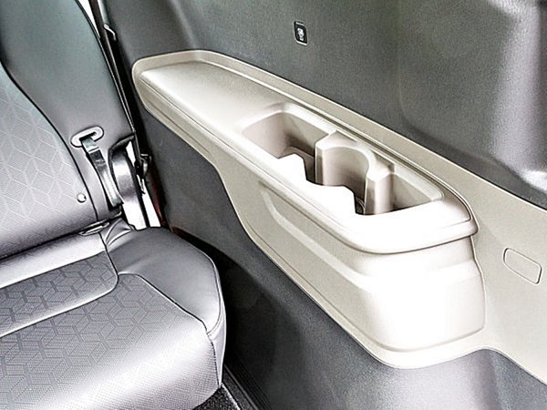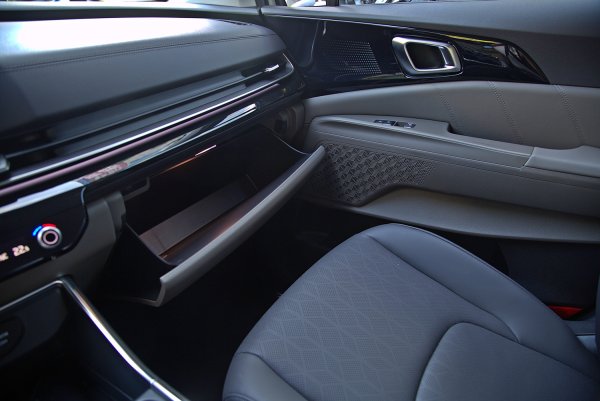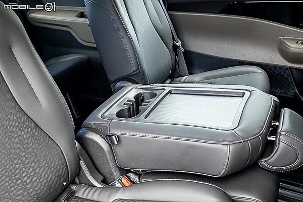 Carnival前座擁有多樣化的置物收納機能,寬大而舒適的中央扶手,下方置物箱寬且深,收納小物十分好用,但少了上下分格的置物功能。前乘客座前方的手套箱也大開口和夠寬的置物空間,取置物也十分方便,門側置物格特長,放物品也方便,而車側扶手也是一個收納小物的置物格。