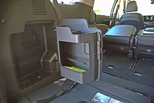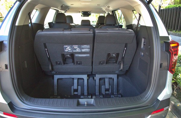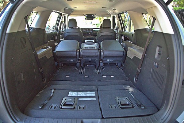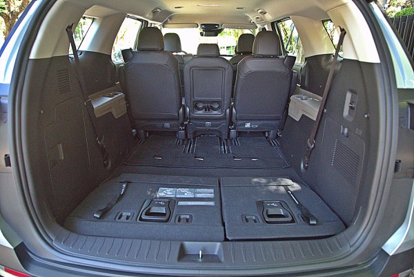 長軸距帶來出色的行李廂置物空間,在8座模式下,行李廂有627公升置物容積,而這容積是計算底板到座椅頂端的深度,事實上,行李廂底板是下凹的設計,預留給第三座椅收摺打平之用,若算入此凹槽,那麼實際置物容積絕不只627公升,而此凹槽更能在8座模式下,放進三只大型旅行箱。第三排座椅收摺後,行李廂容積可擴大至2,905公升,而且底板完全平坦。而第二排座椅還可以前傾收摺,置物深度可以再加長,置物深度足以直接放入三台公路自行車。此外,體感式電動尾門取置物也十分方便。