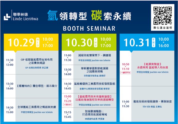 台灣主要工業氣體廠商聯華林德氣體於10月29日 (三) – 31日 (五) 假南港展覽館一館所舉行的「台灣國際智慧能源週/淨零永續展」,以「氫領轉型,碳索永續」為主軸,重磅展示多項第一:台灣首輛氫燃料電池重型卡車公開亮相;影片搶先看,直擊聯華林德台南樹谷「示範性加氫站」;而節能減碳專家林德(Linde)全球商業化總監Joachim von Schéele 博士應邀,首度在台發表演說,提出最新氫能技術、導入實績。聯華林德持續地率先投入,連結產業夥伴,期望在淨零減碳的賽道上加速,推動氫能在移動與工業應用進程。