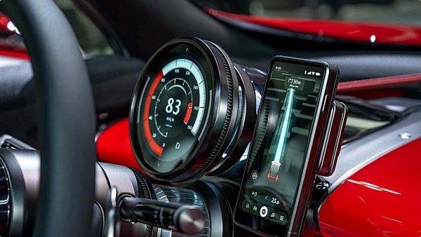 在座艙內部操控界面僅配備十分簡約的三輻平底方向盤,方向盤左右也只有一對按鈕。駕駛座前方有個超大的圓形儀表,除此之外,儀表台再也沒有別的界面,既沒有大型數位儀表,甚至沒有中控資訊娛樂系統顯示螢幕。相反的,儀表旁邊有一個手機支架。