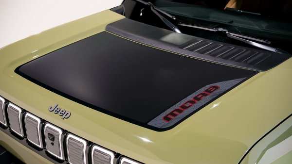 雖然引擎蓋下可能沒有內燃引擎,但 Jeep 的七槽式水箱護罩依然保留著,且每個格柵都有會自動發光,U 形 LED 日間行車燈框住 LED 頭燈組。前保悍設有兩個紅色拖鉤,向外突出以保護LED面板及前臉後方的硬體。車尾配備受 Wrangler 啟發的 LED 尾燈、外推式尾門,以及全尺寸備胎架。
