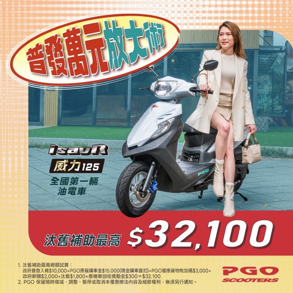 本次 PGO 推出的「普發萬元放大術」誠意十足!讓消費者以最低負擔入手全國第一輛油電車。想要輕鬆擁有 PGO 威力125,體驗節能、省油又安全的新世代油電車通勤生活嗎?現正購買 PGO 威力125 汰舊換新最高補助優惠高達 $32,100。