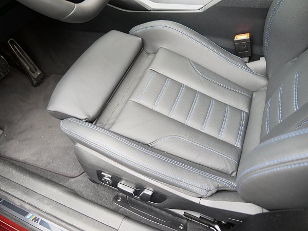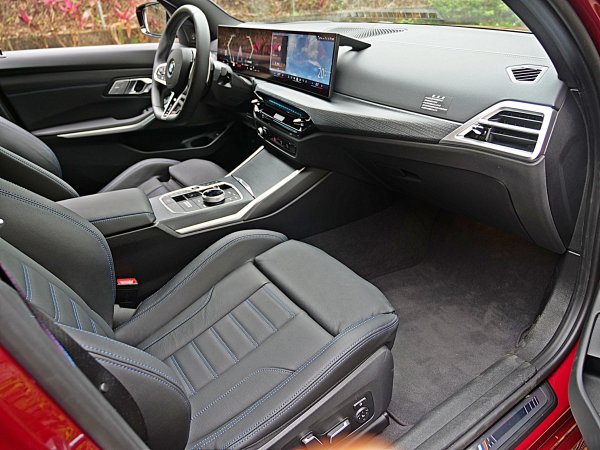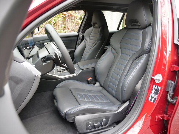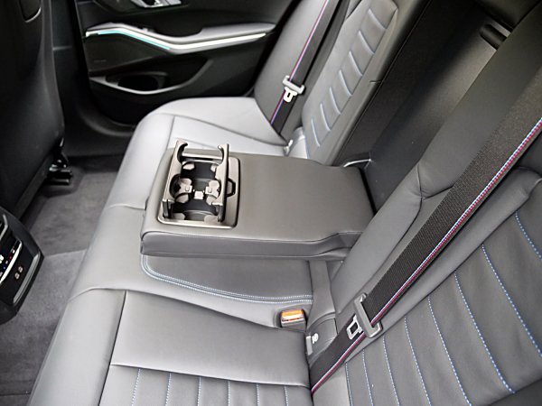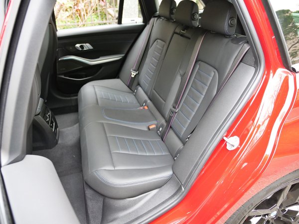 座椅維持原來跑車化的式樣,椅背上加了M的碳纖維銘牌。座椅具備相當好的身體包覆性與支撐性, 330i M Sport採用Alcantara麂皮和Sensatec合成皮革雙材質混搭,結合對比縫線,安全帶也因為Racing Package套件因而為結合M款紅藍條紋的運動化式樣,以提升車室熱血氛圍。雙前座都具備附 2 組記憶裝置的多向電動可調功能並附電動腰靠,同時沿用原有座墊可前伸功能,提供腿部更好的支撐。