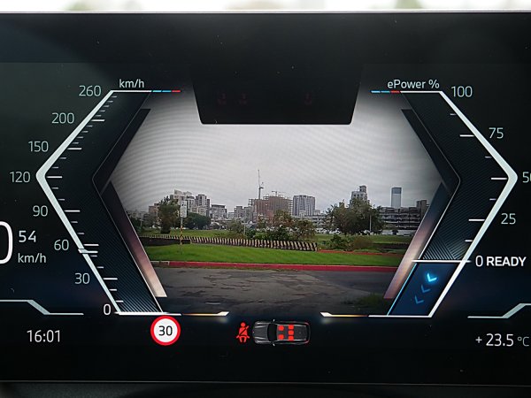 儀表後方是結合首度配備的AR擴增實境功能,且顯示畫面面積超大的抬頭顯示器,讀取數據資訊十分輕鬆,而且有著明晰而易懂的介面,可同時顯示車速、駕駛輔助系統、導航方向及地圖和中控多媒體等訊息,如使用Google Map線上導航,路線指引也會顯示出來,顯示也有三種畫面模式可依駕駛個人的偏好選擇設定,它讓我們在開車時更能減少低頭看儀表的機率,有助降低事故風險。