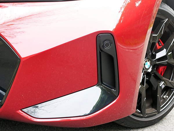 車側車頂線條自C柱微向車尾收斂,搭配車側由前葉子板延伸至車尾的挑高腰線,還有向後方上揚的黑色窗框,C柱還有稱之為霍氏彎角(Hofmeister Kink)倒勾曲線,構成一種靜止中仍有移動感的視覺效果,而19吋五輻雙爪雙色的鋁圈,並採亮黑塗裝,為車側增添動感,因為試駕車加掛Racing Package套件,輪圈內置M Sport套件M款的紅色煞車卡鉗,取代標配的藍色卡鉗,也強化它的性能車印象,而窗框也因Racing Package,以黑色飾條取代原有的鍍鉻飾條。