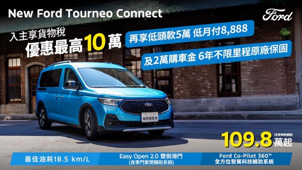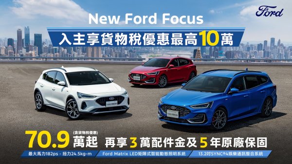 New Ford Ranger Wildtrak搭載Advanced 4WD智慧四輪驅動系統,精準應對各種地形,輕鬆征服險惡路況,享限時感恩回饋價154.8萬(含舊換新),再享百萬0利率;New Ford Focus結合動感外型與德規品質,提供多種車型,從旅行車到跨界休旅一應俱全,入主享貨物稅優惠價70.9萬起,再享3萬元配件金及5年原廠保固;歐洲進口正七人座New Ford Tourneo Connect福特旅玩家,享貨物稅優惠價109.8萬起,再加碼享2萬元購車金、低頭款5萬、低月付8,888及6年不限里程原廠保固;歐洲首選國際商旅The All-New Ford Tourneo Custom福特旅行家,享貨物稅優惠價141.8萬元起,入主再享高額0利率。此外,福特六和感謝辛苦付出的軍警及公教人員,入主New Ford Focus國產車型及The All-New Ford Kuga即可升級2年全方位延長保固方案,提供車主全方位的用車安心保障。