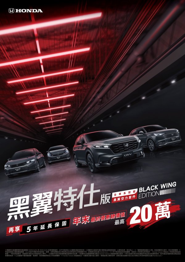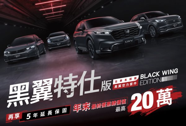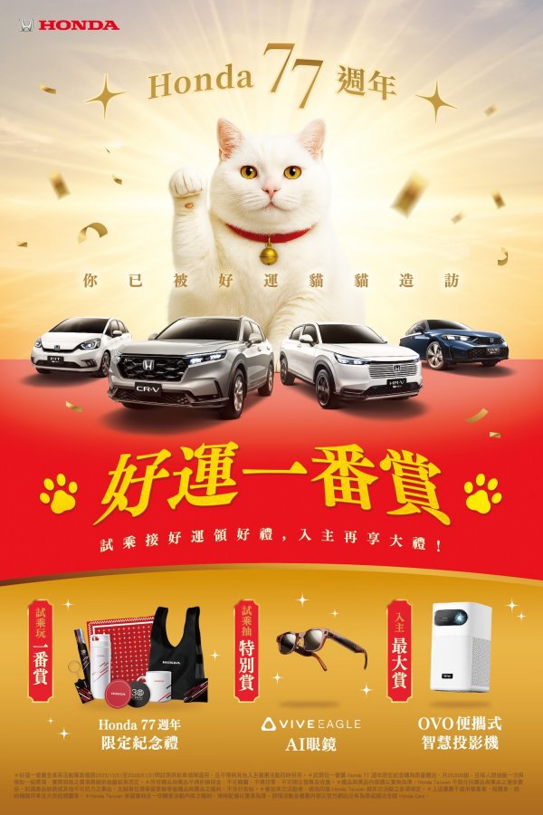 歡慶Honda誕生77週年,Honda Taiwan推出年終超值豪禮,即日起限時入主Honda全車系,享「OVO便攜式智慧投影機」或「黑翼特仕版與5年延長保固」二擇一豪禮,指定車款優惠總價值最高達20萬元。活動期間至全國Honda Cars試乘全車系,即可參加「好運一番賞」活動贈送的「Honda 77週年限定紀念禮」(7抽1)、週週再抽「VIVE EAGLE AI眼鏡」讓您帶回家。歡迎即刻至官網預約試乘或親臨全台展示中心,感受Honda的人車一體操控性能,重新定義您對駕馭樂趣的想像。