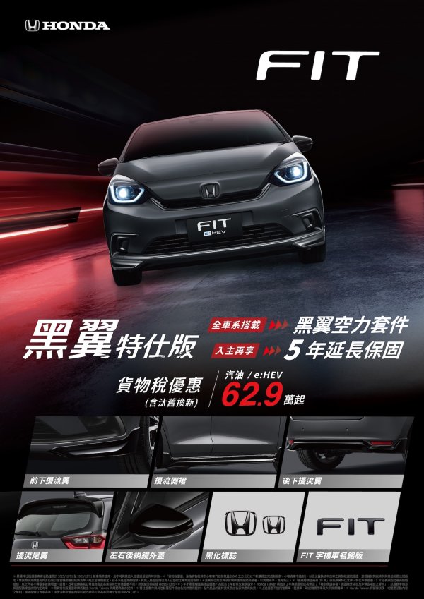即日起~2025/12/31止入主FIT汽油版或節能省油王FIT e:HEV享「OVO便攜式智慧投影機」或「黑翼特仕版與5年延長保固」專案二擇一好禮,並可享貨物稅優惠(含汰舊換新)62.9萬元起。其中特仕版包含「前下擾流翼、擾流側裙、後下擾流翼、擾流尾翼、左右後視鏡外蓋、前後H黑化標誌、FIT字標車名銘版」的專屬豪禮,讓預算型買家購車零負擔。