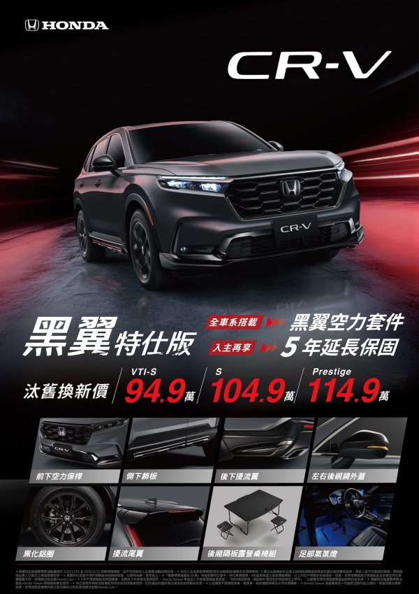 為感謝消費者對CR-V 30年來的一路支持,即日起~2025/12/31止入主CR-V享「OVO便攜式智慧投影機」,並可享汰舊換新價VTi-S 94.9萬元、S 104.9萬元、Prestige 114.9萬元優惠。針對追求動感跑格輪廓與運動化設定的消費者,入主禮可選「黑翼特仕版與5年延長保固」專案,其中特仕版內容為「前下空力保桿、側下飾板、後下擾流翼、左右後視鏡外蓋、黑化鋁圈、擾流尾翼、後廂隔板露營桌椅組、足部氣氛燈」,總價值最高達20萬元優惠,實現滿載全家人的移動夢想喜悅。