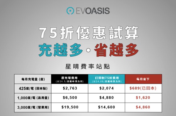 EVOASIS 今(5日)宣布全新訂閱制優惠正式上線,推出「月付 $688 充電 75 折」方案,鎖定職業駕駛、營業用車主及每月高用量充電族群,讓常跑通勤、外勤與長途旅遊的電動車車主,在全台超過 80 座指定 DC 快充站與國道服務區據點,都能以更划算的價格補足電量。
