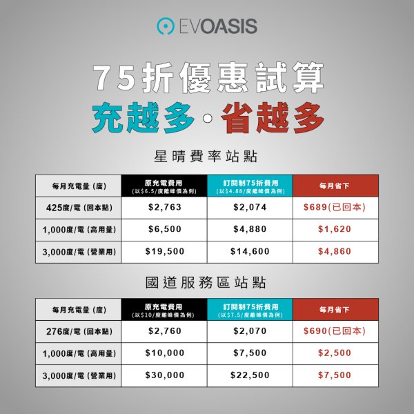 • 每月 $688,享 EVOASIS 指定 DC 站 充電費率 75 折