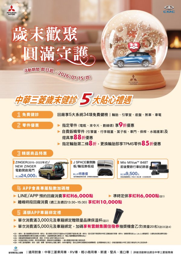 冬季是車輛保養的關鍵期,中華三菱特別規劃包含輪胎、引擎室、底盤、煞車及車電系統等5大系統,共計34項免費檢查,確保愛車維持最佳狀態。針對維修需求,活動期間指定零件如電瓶、來令片、劃線碟享9折優惠;更換指定輪胎第二條享8折,並加碼TPMS零件85折優惠,讓車主以最實惠的價格完成愛車整備。