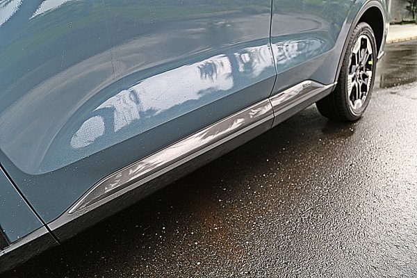 不同於車頭的霸氣,車側造型則顯得比較有運動感,車門鈑件內凹,加上向王尾上揚的雙腰線,還有立體突出並加了鍍鉻飾板的側裙,以及外凸的輪拱,車頂線條也向車尾垂墜,使車側呈現轎跑車一般的輪廓。輪圈造型則顯得比較呆板,全車系皆採用19吋規格雙色切削輪圈,採五輻齒輪造型設計,配胎為235/50R19規格的馬吉斯M3,是乾濕兼顧且耐磨耗的實用胎。