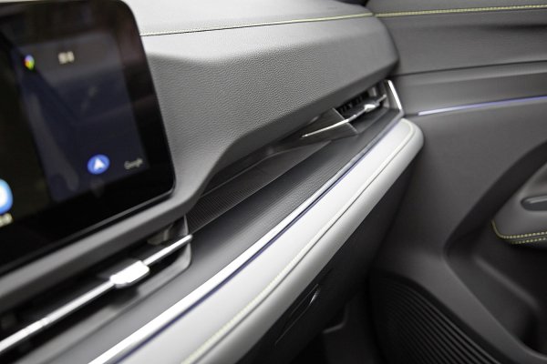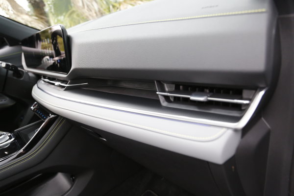 運動化風格的下平握把三輻式方向盤採真皮包覆並結合「琉光綠」雙縫線,它的質感也比絕大多數同級車好,單一一種皮革包覆,但方向盤中段,即雙手操駕經常握住的部分則採打孔處理,讓操駕時有更好抓力而且不怕手汗,由此細微處的設計可見Territory設計並不因車價親就很馬虎。