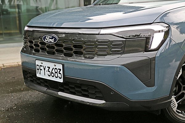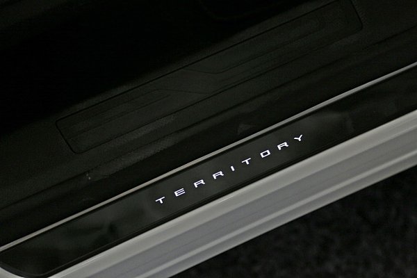 Territory不只車身尺碼大一號,造型設計也用了放大的設計手法,車頭大面積水箱護罩格柵橫亙整個車頭,格柵上方還有LED光條構成的定位燈,銜接左右頭燈和戰斧造型倒L形日行燈,這樣貫穿式設計,在許多品牌新世代車款普遍可見,如現代Santa Fe,加上格柵與車頭鈑件融為一體,非傳統獨立的格柵,這兩項設計讓車頭變得更加寬闊,而梯形的前保桿和下方蜂巢式格柵和突出的前翼與下護板,則增添幾許運動感。