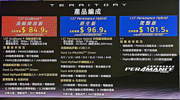 今年福特六和以CKD方式在台灣生產組裝Territory,全車系共兩套動力、三個車型編成,雙動力各是1.5T Per4mance Hybrid四電驅渦輪油電及1.5T渦輪增壓汽油引擎。由於採用江鈴福特的平台架構,降低成本,因此Territory國產化具備了價格上的競爭優勢,在台灣上市含舊換新及貨物稅減徵補助,入門車型1.5T 渦輪闊境版售價84.9萬(原價94.9萬),中階車型油電車型1.5T Per4mance Hybrid 原生版,售價96.9萬(原價104.9萬),頂規油電車型1.5T Per4mance Hybrid驚艷版101.5萬(原價109.9萬),而我們今天試駕的頂規油電車型1.5T Per4mance Hybrid驚艷版。