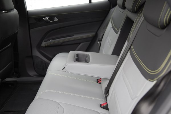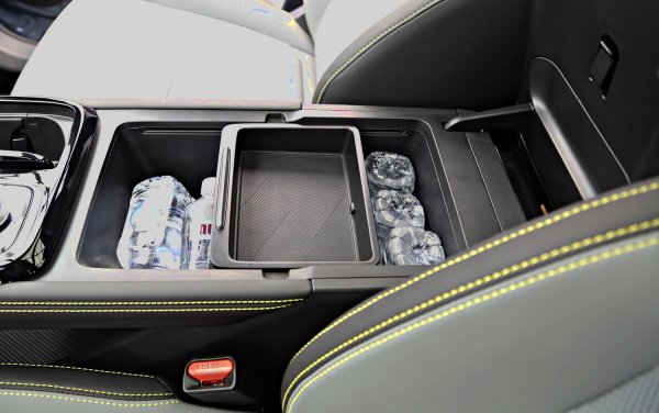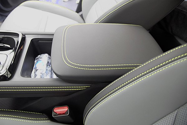 類似豪華車的特別寬大的中央扶手,提供極佳的手肘靠放功能,下方配置既深且寬的置物箱,其容積之大最多可放進15罐瓶裝水,上層還有前後滑移的置物盤。收納功能相當好,而中央鞍座採懸式設計,下方鏤空,是半開放式置物空間,可放手拿包等中小型物件,這空間內還有Type-A和Type-C的USB插槽各一,加上12V的電源插孔。