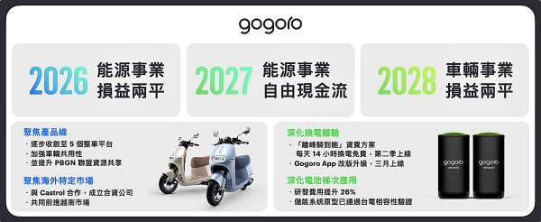 Gogoro 代理執行長姜家煒表示,作為一家能源科技公司與機車公司, Gogoro 的目標非常明確,就是實現獲利並持續穩健成長。團隊已經積極展開行動,專注核心業務,打造更加滿足客戶需求的產品與服務。我們有信心透過四大策略,能夠在 2026 年達成能源事業損益兩平,2027 年能源事業產生自由現金流,以及 2028 年車輛事業損益兩平。
