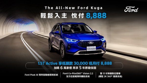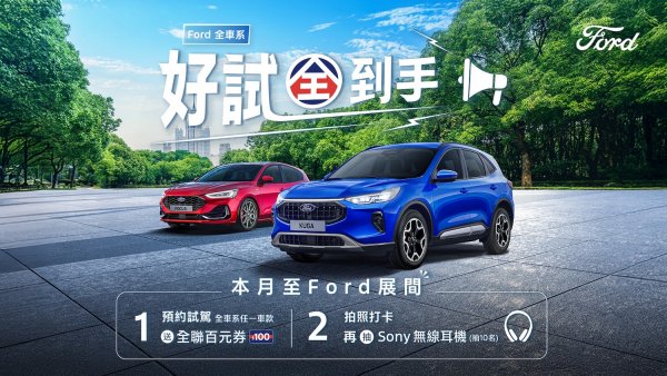 開著Ford一同啟動秋日旅程,自2025年9月1日起至9月30日止,至全台Ford展示中心試駕任一車款,即可獲得全聯百元購物金,於展示間拍照打卡上傳Ford(TW)官方臉書粉絲團指定貼文,就有機會抽中Sony無線耳機;本次限時優惠涵蓋多款熱銷車型,The All-New Ford Kuga入主1.5T Active車型享3萬元低頭款與低月付8,888元,另享5年原廠保固與6萬豪禮;New Ford Focus全車系享舊換新75.9萬元起,活動期間入主國產車型贈送3萬元配件金及5年原廠保固; New Ford Ranger Wildtrak FRS Edition提供百萬0利率購車優惠,並額外加贈1萬元購車金、3萬元配件金及5年原廠保固;New Ford Tourneo Connect福特旅玩家享有高額0利率購車優惠及5年原廠保固 ,舊換新114.8萬元起享樂入主歐洲進口正七人MPV;承襲Transit家族六十周年傳奇歷程,The All-New Ford Tourneo Custom福特旅行家全新到港,舊換新146.8萬元起,即刻開啟舒適嶄新旅程。此外軍警公教人員入主New Ford Focus國產車型、The All-New Ford Kuga指定車型,可再享有2年原廠保固方案;搭上秋季出遊熱潮,多項限時入主優惠方案全面啟動,敬請把握機會輕鬆入主Ford好車。