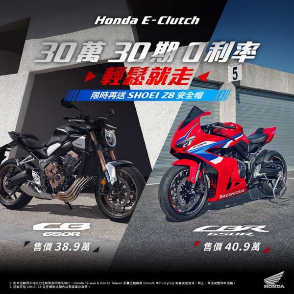 本月特別推出 「輕鬆就走」 專案,凡訂購搭載劃時代科技 CB650R E-Clutch 與 CBR650R E-Clutch,即可享有 30萬30期零利率,限時加送Shoei Z-8 安全帽,不僅帶來更純粹且俐落的換檔體驗,更以頂級防護守護每一段旅程,完美融合風格與安全。除了E-Clutch車款之外,也為多款人氣機種提供超值的「通通零利率 追風零阻力」專案,全車系指定車款最高享72期、0頭款、0利率 再送3萬專屬購車金,不論是日常通勤、假日出遊或冒險壯遊,都能無壓力且無負擔入主Honda人氣二輪機種,享受專屬於騎士的馳騁自由。