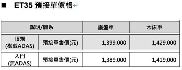 ET35 以純電驅動為核心兼顧節能效益,為企業打造低碳排放的綠色運輸方案。車型選擇包含木床車型,3,362mm長貨台設計,兼具載貨及運輸效率。另提供底盤車型,能進行多樣化車身打造,充分展現商用車的實用與運輸效率。ET35搭載領先同級的LEVEL 2 ADAS先進駕駛輔助系統,包含附行人偵測的FCM主動式智慧煞車輔助、全速域的ACC主動車距控制巡航系統、LKA車道維持輔助,能大幅提升行車安全性,降低事故發生機率。讓每一次的安全行駛就是賺錢的機會。ET35搭載76.5度的磷酸鋰鐵電池,NEDC測試續航里程達360公里,並支援 CCS1 快充,充電20%至80%僅需35分鐘,能迅速補充電量,告別里程焦慮。