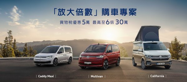 福斯商旅全車系滿足消費者對移動生活的全方位想像,無論是家庭日常、戶外車宿,或是專業商務接送,都能提供最適切的移動方案。本次「放大倍數」購車優惠,呼應政府新車貨物稅減免與汰舊換新政策,更展現福斯商旅持續陪伴車主邁向全新旅程的承諾。「放大倍數」購車方案即日起正式開跑,活動至本月底止,誠摯邀請消費者把握入主良機,同享VanLife 樂旅人生,欲了解更多產品資訊或促銷方案,請洽福斯商旅全台授權經銷商或官方粉絲團(https://www.facebook.com/VW.Bulli.Taiwan/)