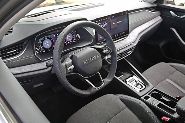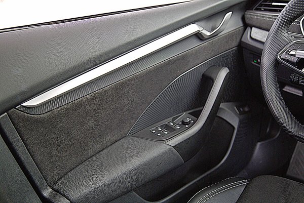 Octavia Combi儀表台和門側採用Suedia 類麂皮結合對比縫線的包覆,搭配花俏的雲曜灰石岩飾板和金屬裝飾,以及可自行選色的各種主題式 10 色環艙氣氛圍燈,營造出兼具科技感與舒適感的現代氛圍。門側飾板也維持原來多重材質的運用,加上波紋式音響罩和如立體裝置藝術般的鍍鉻門把和飾條,都是十分迷人的藝術風格。而改款後,儀表台中央飛翼造型飾板則是更換類碳纖維飾板,增添跑格。刻上Octavia車名的車門檻雙色飾板和鋁合金踏板、也凸顯它類跑車的運動風格。