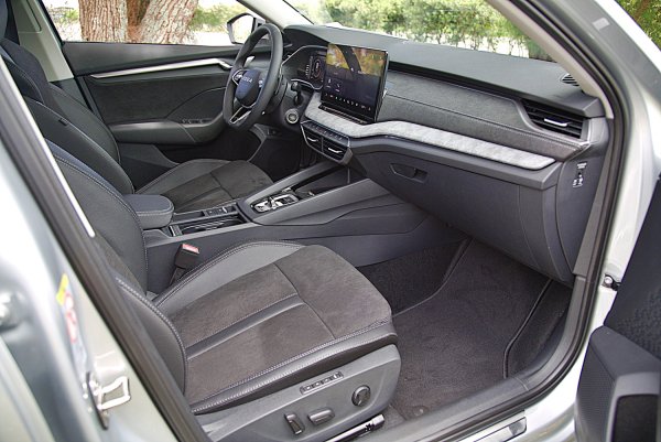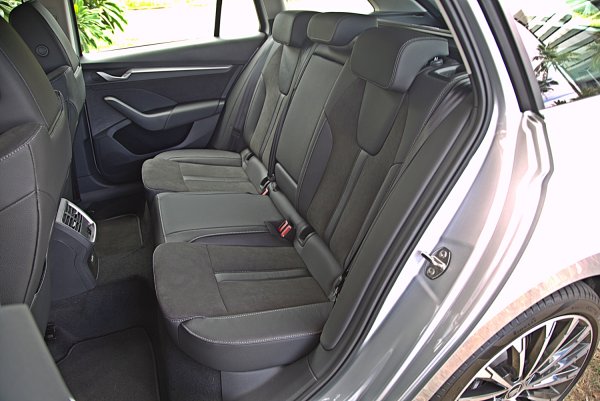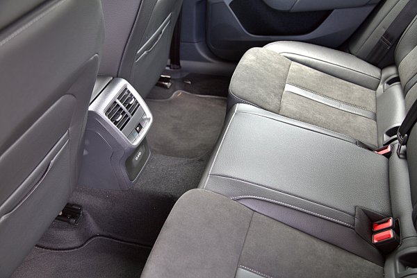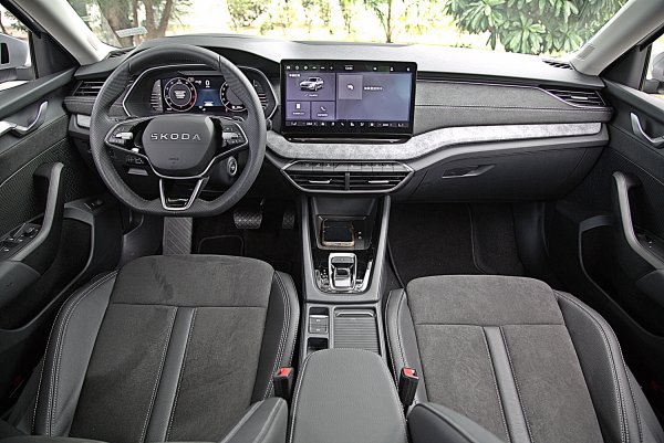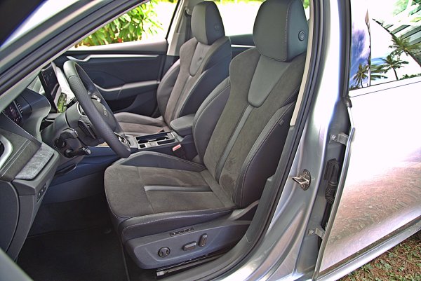 座椅式樣和Octavia Combi RS幾乎相同,是十分跑車化的設計,具有相當突出的包覆性設計,只差沒有RS車型座椅椅墊上的菱格紋縫線和紅色的滾邊,座椅面料採真皮和類麂皮雙材質混搭,整體來說,座椅的包覆和支撐性都相當出色,尤其身體的包覆充足,又不會太讓人感到不適,身體腰部和腿部支撐皆有相當水準,尤其是座椅椅墊有突出的腿靠設計。而雙前座都標配電動可調,而且都具備3組記憶功能和腰靠。