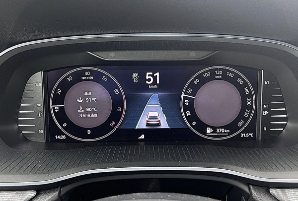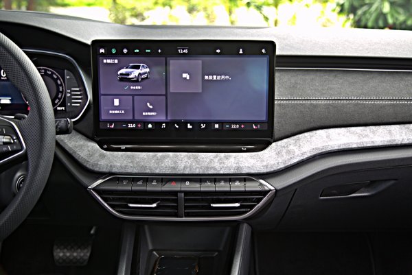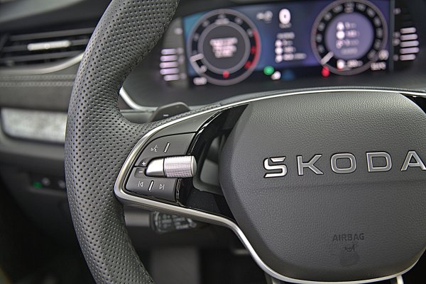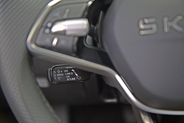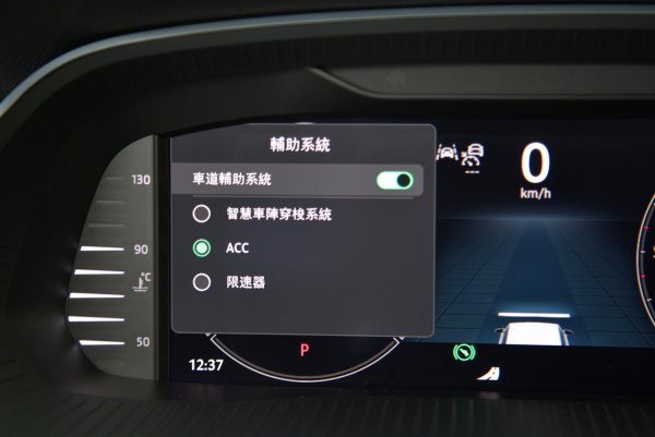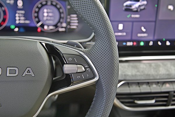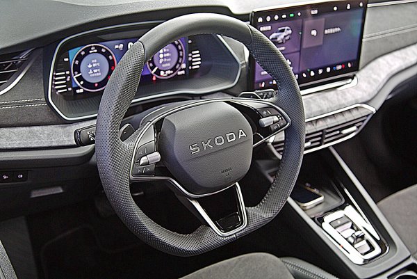 Octavia全車系一致配備運動風格強烈的三輻式下平握把多功能方向盤,結合皮革包覆與灰色對比縫線,盤輻配上高質感的鋼琴烤漆飾板,並有突起設計,提供極佳的握感,左右結合滾輪的功能按鍵,操作比較精準,左右各有全速域ACC功能啟動設定鍵,還有聲控與中控多媒體控制按鍵等,操作也相當順手。同樣的,ACC車距和車速設定等主動駕駛安全輔助的功能設定,仍靠方向盤左下的撥桿操作,操作的便利性稍稍不足,如果能整合在方向盤上操作會比較理想。