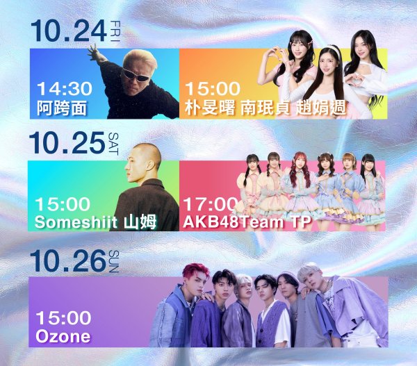 ¬¡°Ê´Á¶¡¨C¤éÁܽЫ¶q¯ÅÃÀ¤H¤Î¤H®ð¤k¹Î½üµf¤W°}¡A±a¨Ó¼é¬yµ¼Ö»P»R¥x¤¬°Êºt¥X¡C10/24(¤)¶}¹õ¤éÁܽмH«¢ºq¤â-ªü¸ó±»PÁúÄy°Õ°Õ¶¤-«nþ^s¡B»¯®S¶g¡B¦µÌÉÀƼö±¡À³´©¡A10/25(¤»)¥Ñª÷¦±³Ì¨Î·s¤H-¤s©i¤Î¬¡¤O°¸¹³¤k¹Î-AKB48 Team TP ±µ¤Oºt¥X¡A10/26(¤é)«h¦³·s¥Í¥N¶W¤H®ð¨k¹Î-Ozone¼ö¤Oµn³õ¡A10/27(¤@)«h¥Ñì¹Ú¥Nªí¶¤-·s¦Ë®ç¤s°ê¤p¦X°Û¹Î±a¨Ó§O¨ã·N¸qªº®õ¶®¤ÑÅ£¦X°Ûªíºt¡A¬¡°Ê¥|¤é¼é¬y»R¥xµ®ö¤£¶¡Â_¡Aµ¹±z¼ö¤Oº¡¸üªº¤j¨®¯à¶q!
