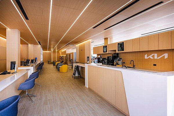 KIA森那美直營台北旗艦店內的設計靈感,來自於自然與人文的對話,外觀以簡潔大器的單色系勾勒,內部透過溫潤木質色調營造舒適氛圍,展現Kia 「Opposites United 對立的和諧」設計理念。整座基地面寬達54.7公尺、縱深47.6公尺、近800坪的廣闊空間:一樓展示區可同時展出9部新車,可將KIA全車系完整展示,包含電動車專屬的「EV Zone」,搭配KIA電動車採用的十大永續材質展示牆;同時規劃獨立洽談空間與尊榮VIP交車室,提供靜謐貼心的諮詢服務與賞車環境。展示區後方則設有寬敞客休空間,結合親子休憩區與書牆,提供人文、古典、藝術、財經等選書,並導入由專人提供的星巴克咖啡服務。