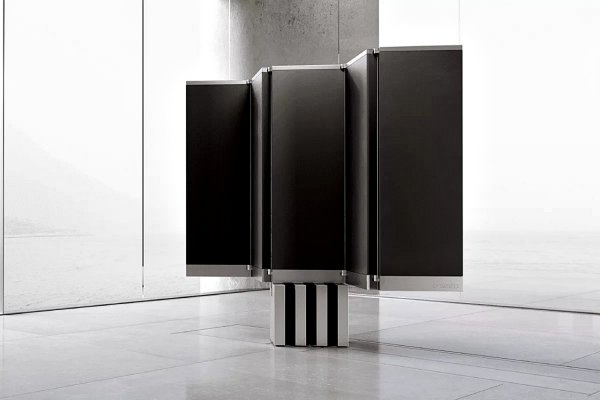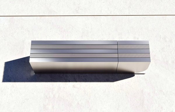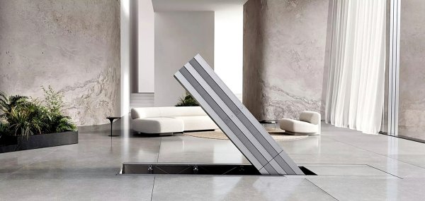 不過,只要按下按鈕,螢幕就會自動旋轉到垂直位置。接著五塊微型LED面板(戶外版為七塊)開始展開,據悉它的螢幕「色彩鮮豔」且亮度達1,000尼特。而它的音效也是精心歸畫的,每片螢幕都內建全音域音響系統,因此不需要用廉價的音響條或環繞音響系統,它本身就能創造極佳的音場效果。戶外版本的運作方式與室內顯示器相似,但可配置較高的柱子、六喇叭音響系統,甚至在不使用時可折疊放入地底下的儲物格內。