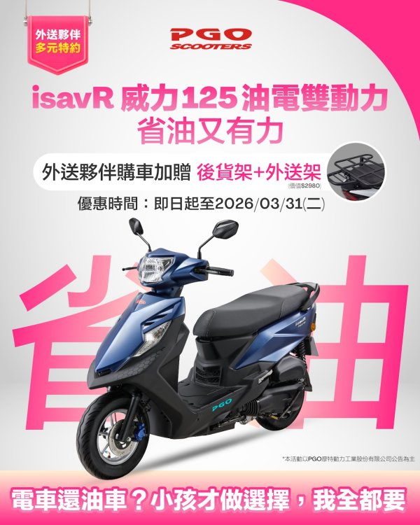 普發一萬元怎麼花最有感?PGO 給外送族最直接的答案:換一台油電車更省、還能賺!PGO 宣布推出「外送族加碼專案」,凡購買全國第一輛油電車 PGO 威力125,除可享普發現金放大與多項購車補助,外送員再加碼贈送「原廠後貨架組」,省油、能載、耐跑,一次滿足外送工作者最核心需求,威力125絕對是最聰明的升級好選擇。