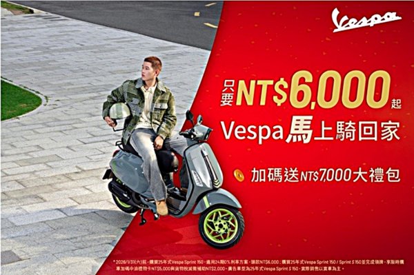 為迎接2026農曆新春假期,Vespa總代理太古運通於農曆年前推出限時加碼購車優惠活動。即日起至2月14日止,入主Vespa全車系任一車款並完成掛牌者,即可參加「全車系新春加碼抽」活動,有機會獲得價值NT$8,000的晶華酒店住宿抵用券。
