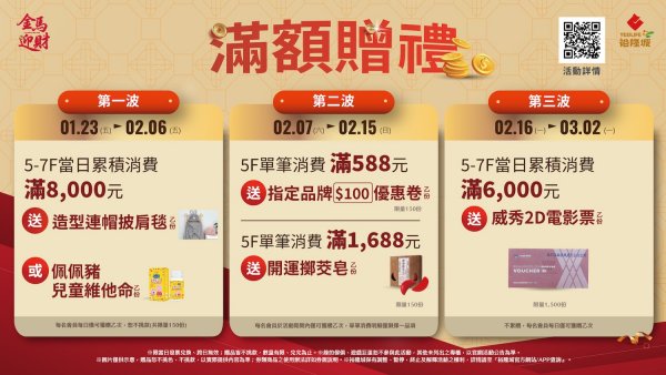 第二波(2/7-2/15):5F單筆消費滿588元贈100元優惠券,滿1,688元再贈開運擲筊皂。