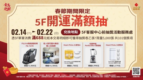 2月14日至22日同步推出「裕隆城開運滿額抽」活動,5F單筆消費滿688元即可參加抽獎,包含FUJI AI智能按摩椅、五星飯店住宿券等共101項獎品,為春節消費增添好運與驚喜。