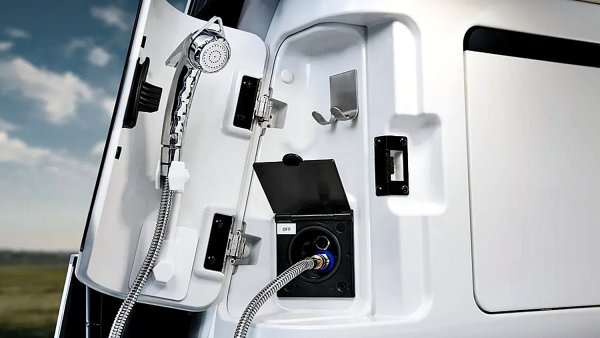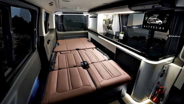 Hyundai 的電動露營概念車確實加一般常見的露營改裝,讓它成為車主的第二個家。配備電動彈出式車頂帳,後座只需按鍵即可讓座椅摺疊,變出一張雙人床。車頂還裝有太陽能板,每天可產生2.6kWh電力,能延長Staria的純電續航里程,或支援36公升冰箱、便攜式淋浴與座艙溫控系統等電器用電。其他配備包括小廚房、窗簾、可電動調光後窗及滅火器。