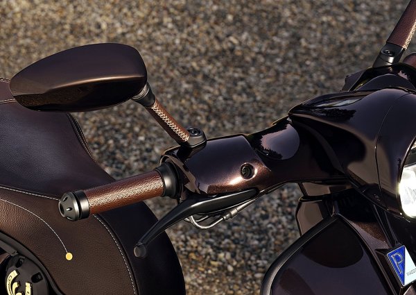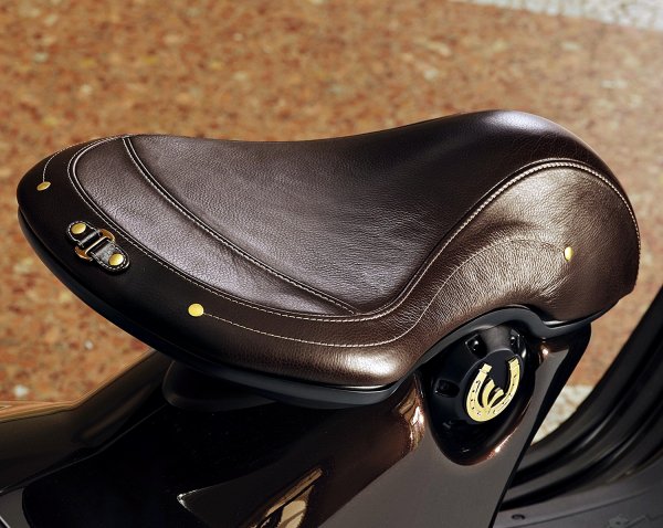 這款限量的特仕版採用獨特的「月桂棕」(Bay color),這深邃的棕色調令人聯想起馬匹深邃且富有光澤的毛色。鋼製車身透過霧面與亮面交錯的細節處理,並點綴精緻的金色飾面,例如座墊下方隱藏著一處珍貴細節:一枚金色的馬蹄鐵,環繞著 Vespa 的「V」字標誌。在手把上,天然皮革與承襲經典的工藝相遇:細緻的菱格紋車縫線由職人精湛手藝勾勒出。這一微小卻足以定義風格的關鍵細節,為騎乘體驗注入最純粹的質感。後視鏡與手把設計相輔相成,在風格與傳統之間取得完美平衡,成就這款車最鮮明且獨特的視覺美學。