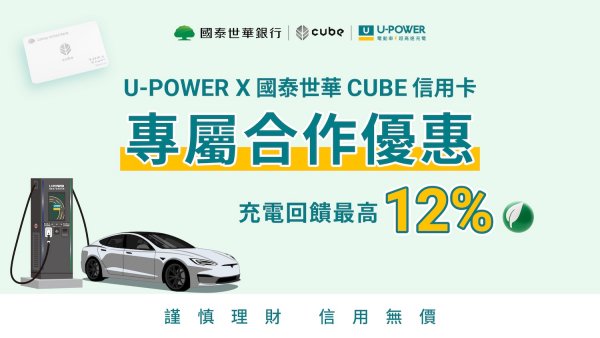 針對已持有國泰世華 CUBE 信用卡的 U-POWER 會員,本次合作更獨家推出「領券滿額加碼回饋」方案。至 2026 年 3 月 31 日前,U-POWER會員只要於國泰世華 CUBE App 領取指定優惠券,並於 U-POWER App 以國泰世華 CUBE 信用卡支付充電費,當月累積消費達NT$1,000(含)以上,即可再享加碼 5% 小樹點(信用卡)回饋,每正卡戶每月回饋上限 100 點,進一步放大充電消費的回饋效益。