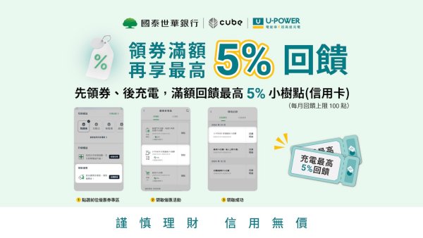 本次合作首波主打「指定申辦新戶享 5% 回饋」,凡符合國泰世華銀行新戶資格的 U-POWER 會員,於 2026 年 6 月 30 日前透過專屬連結申辦並核發國泰世華 CUBE 信用卡正卡後,於 U-POWER App 以該卡支付充電費用,即可享有 5% 小樹點(信用卡)回饋,每月最高回饋 100 點小樹點(信用卡) ,讓符合新戶資格的會員從第一筆充電消費開始,即可享受實質回饋。
