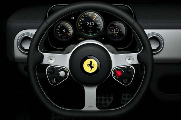三輻細握把方向盤是向 Nardi致敬的設計,該設計曾裝配於 20 世紀最具代表性的法拉利車款。事實上,據說它的設計靈感來自Jonny Ive個人收藏1950年代的250 Europa。它配備大量實體按鍵,加上不同電動駕駛模式切換與動力系統的設定功能,另外還有管理煞車動能回收力道的撥片。