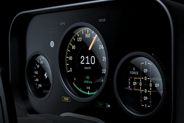 極具技術性的數位儀表板由八層不同組成,前兩層是獨立且客製化的三星 OLED 螢幕。它們用來呈現三層旋鈕視角:中間那層顯示速度(並配有實體指針),另外兩層則可依所選動力系統設定自訂(例如左邊顯示再生煞車,右邊顯示拉動的 G 力)。