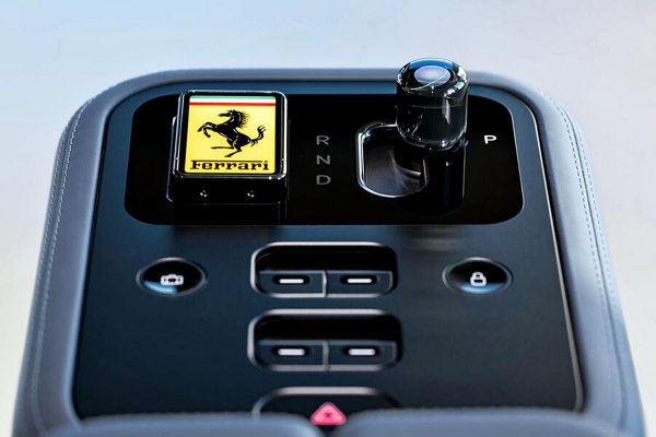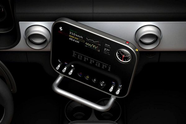 環繞儀表台的黑色塑膠表面,其實也是一塊 OLED 螢幕,會顯示警示燈、導航以及通常位於現代法拉利方向盤頂部的換檔輔助裝置。中控台設計成懸浮式設計,由皮革與玻璃混合材質組成,玻璃則有霧面(用於最常用區域以避免指紋)與光澤表面。